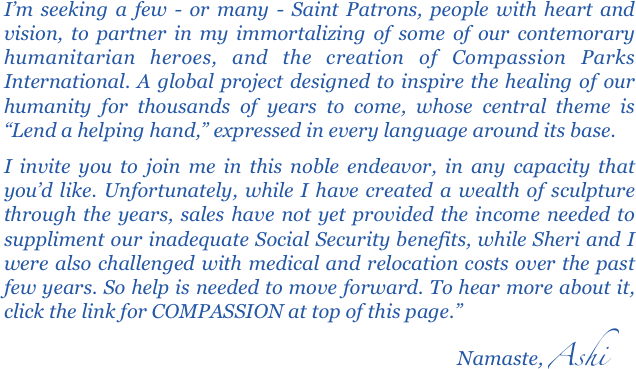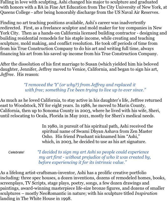 “While creating art has saved my life, and I truly admire great talent when I see it -expressed in any medium - I also must say that what really gets my goat, my pet peeve, is body casters who claim their body casts were actually sculpted. Fact: a body cast is no more a sculpture than a photograph is a painting. (Read Ashi’s published article, “Which is it, Art or Craft?” ARTICLES BY ASHI page).